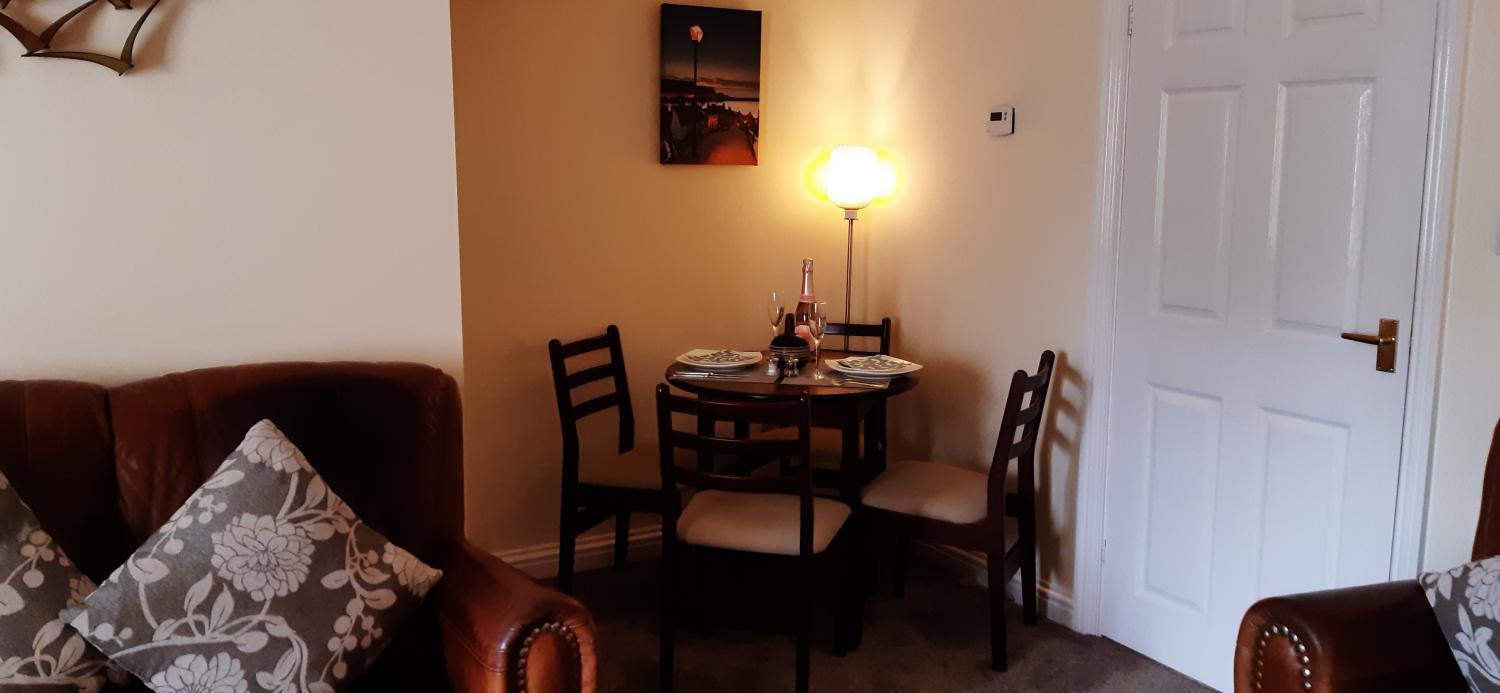 The large lounge has a cosy eating area with dining table and 4 chairs, quality leather suites, dark wood furniture and a flat screen TV with Sky Freeview and a DVD player.